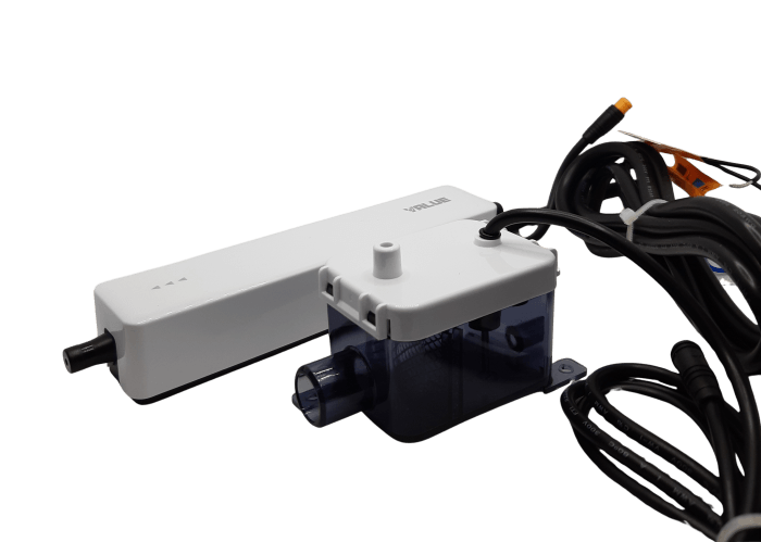 W zestawie: pompka, zbiornik z czujnikiem poziomu skroplin, akcesoria montażowe